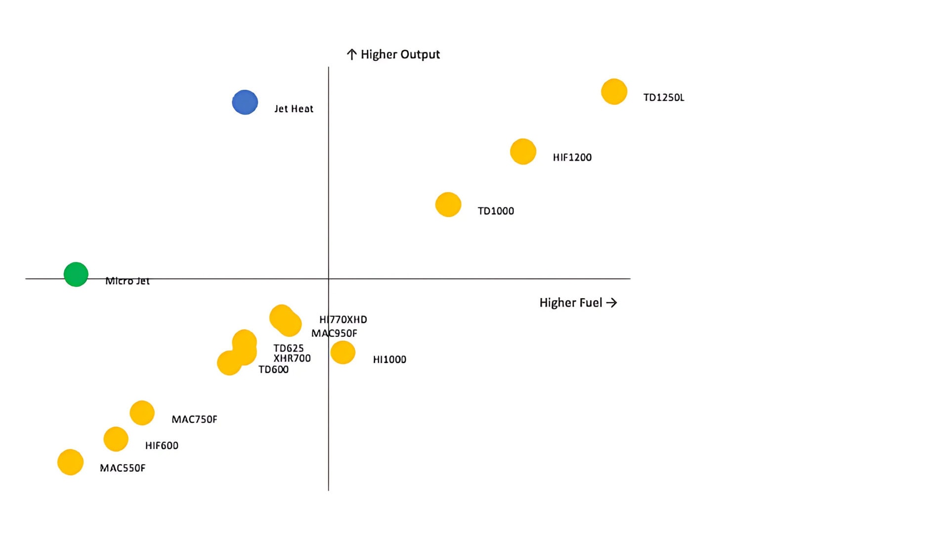 Jet Heat and Micro Jet achieve superior performance ratios by delivering strong heat output with comparatively low fuel use. Jet Heat sits in the top-left quadrant, the optimal zone of high output with low fuel use. Micro Jet delivers slightly lower output but remains highly efficient. This efficiency means fewer units are needed to meet project requirements, which reduces site congestion, minimizes ducting and setup complexity, and lowers ongoing fuel logistics.